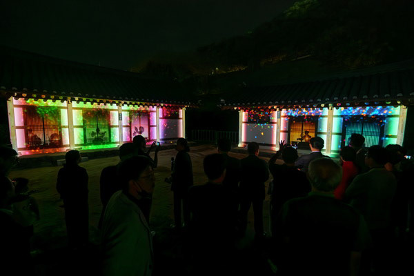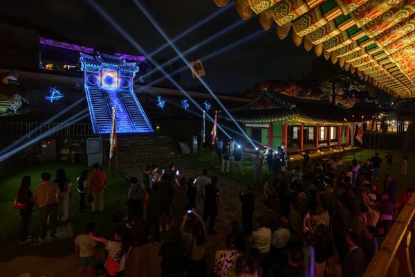 A projection mapping show on the Jigwamun gate, visualizing its name ("put down the spears"). It depicts the procession of soldiers returning from war, laying down their weapons which turn into light, symbolizing the arrival of peace.