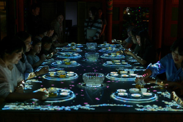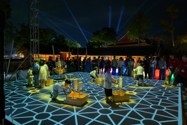 An interactive experience zone inside the Unjudang, once a war council hall. Visitors engage in a "strategy interaction" game on a floor map of light, where their decisions and collaborations shape the path forward.